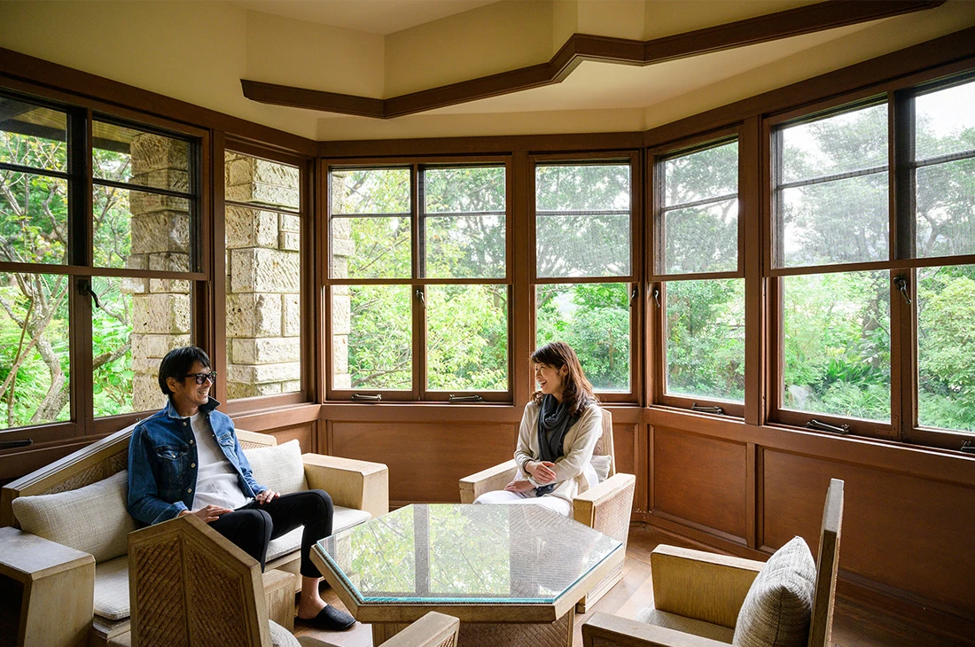 大谷石が敷き詰められたアプローチ、吹き抜けのサロン、そしてサンルーム。100年の時を経ても色褪せないこの空間には、遠藤が徹底した「座った時の目線の心地よさ」が息づいています。